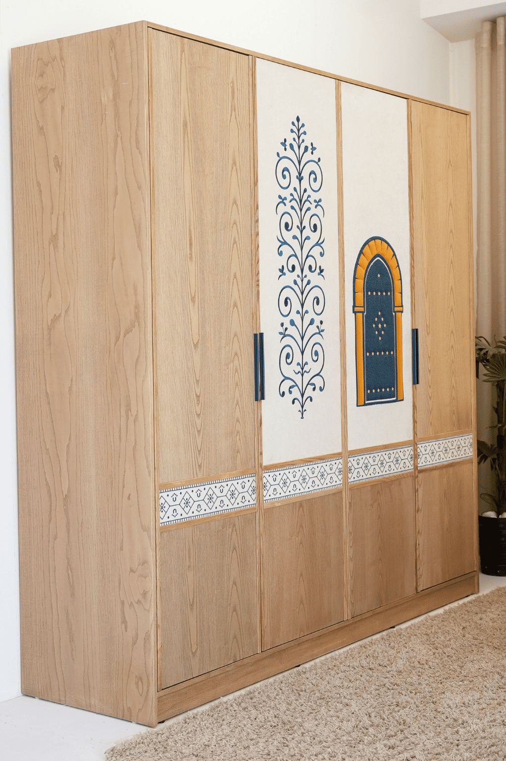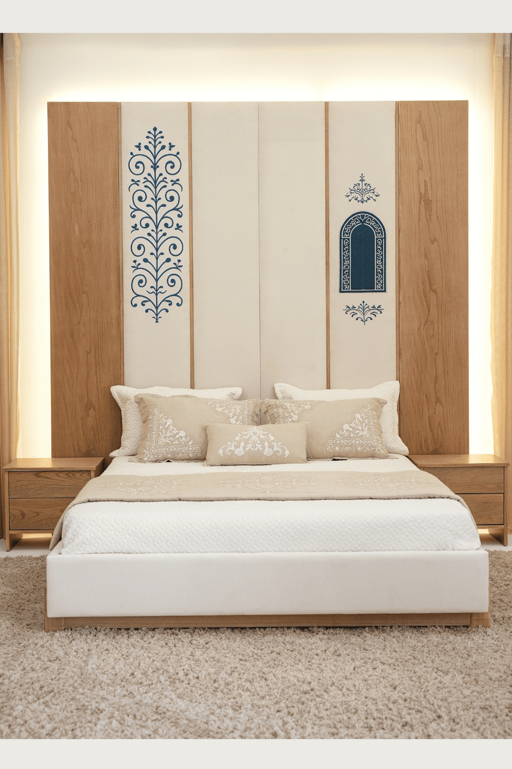 Cette chambre à coucher Julie offre un design élégant mêlant modernité et touches artisanales, avec des matériaux de qualité et une ambiance chaleureuse, idéale pour un espace de repos confortable et raffiné.