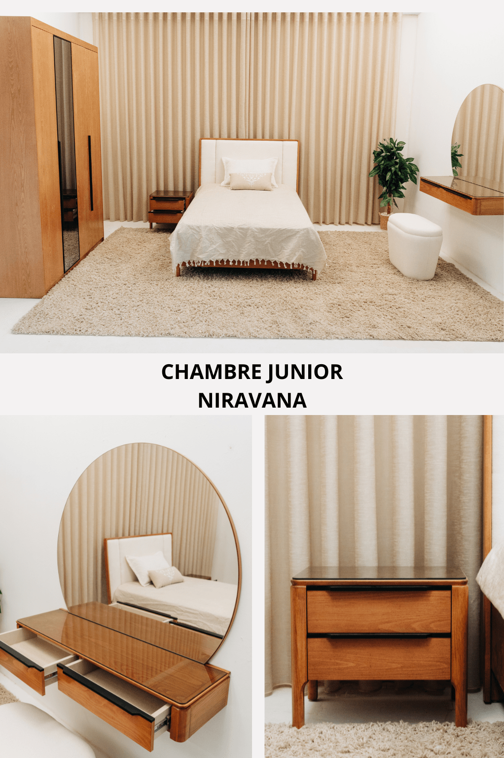 La chambre junior Niravana offre un design moderne et chaleureux, alliant confort, fonctionnalité et finitions soignées. Pensée pour le repos, le rangement et l’apprentissage, elle crée un espace pratique et élégant adapté au quotidien de l’enfant.